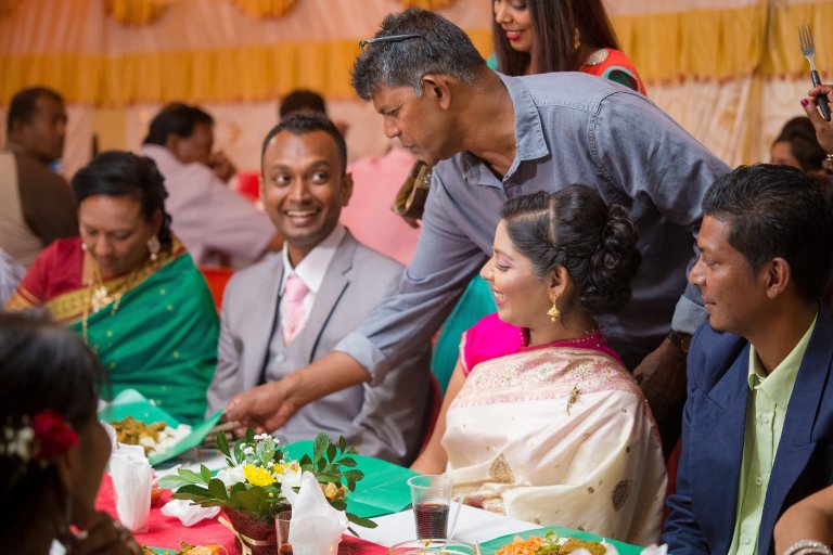 A very common ritual in Telugu and Tamil Weddings: Relatives have to put money under the leaves of the newly wedded couple and they make them eat one spoon of the meal