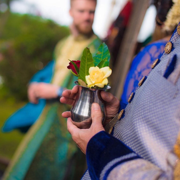 As a sign of welcome, the Dulahin’s father presents the Dulaha’s father with a lota filled with water, five coins, mango leaves and flowers